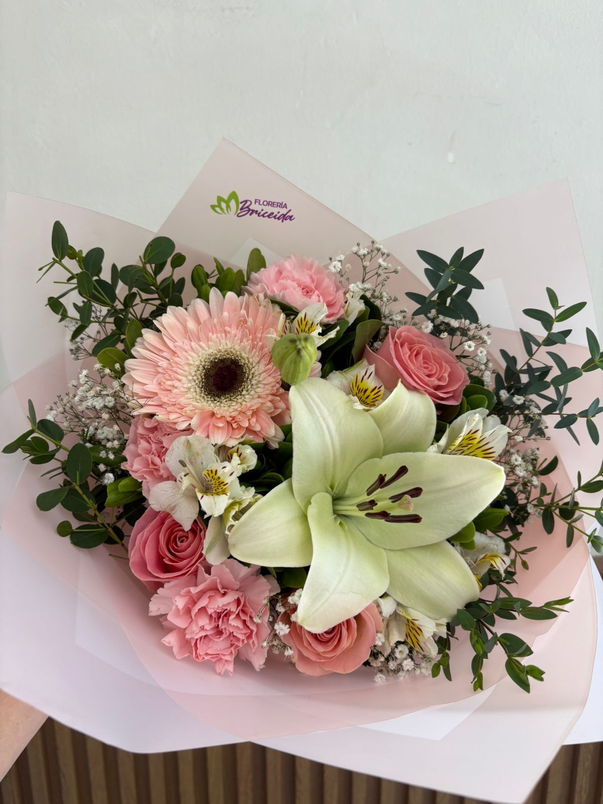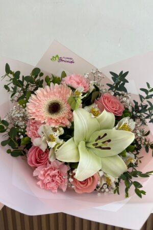 Diseño moderno con 24 Rosas Rosas y lilis, el arreglo incluye: