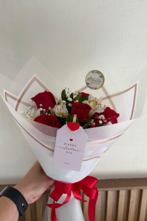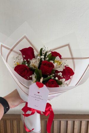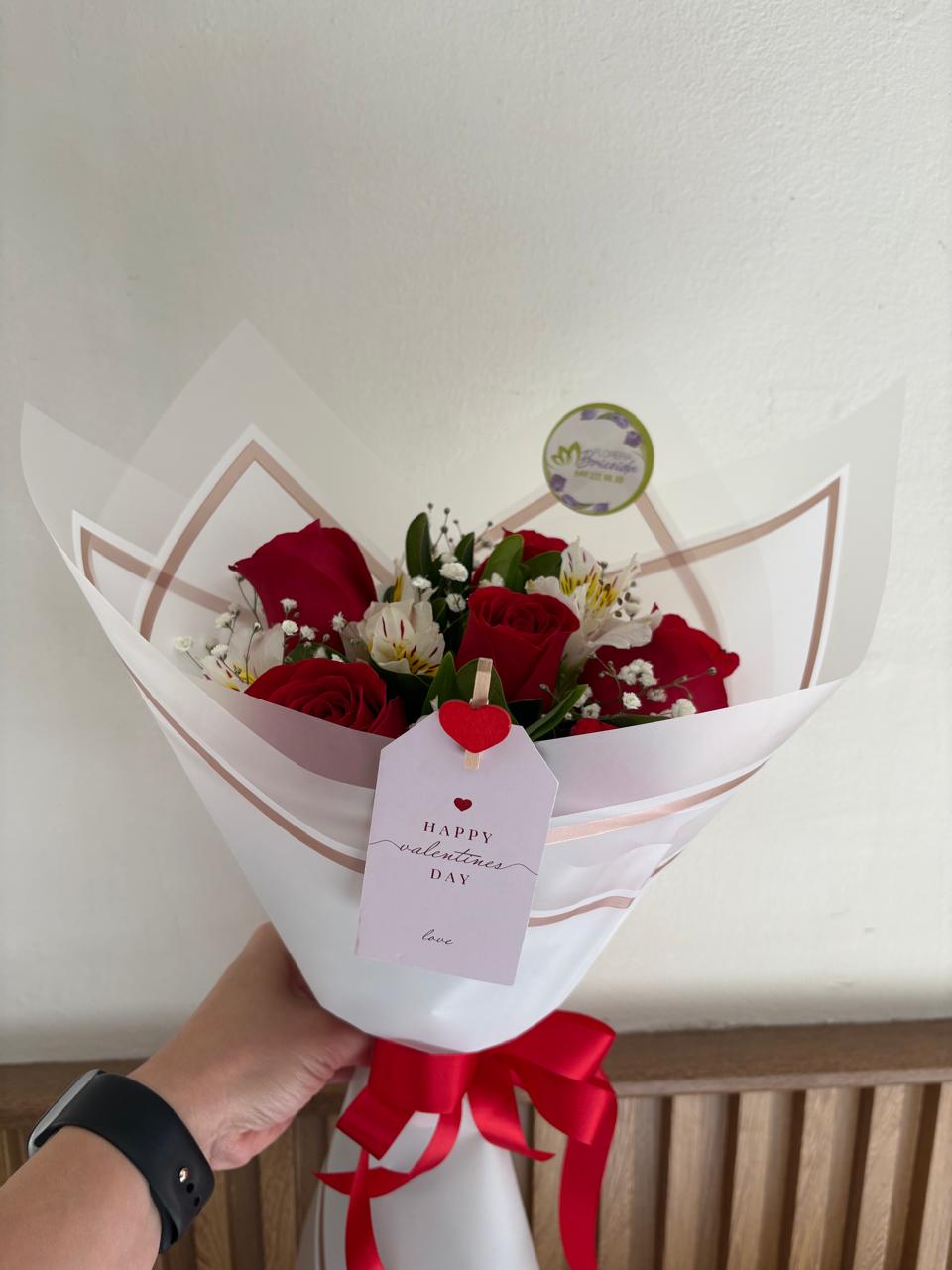Ramo de mano con 6 rosas rojas envuelto en papel decorativo. (El papel decorativo puede variar según existencia)