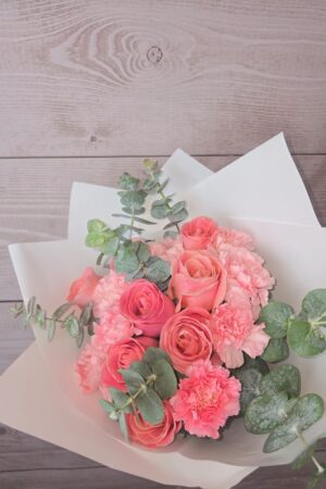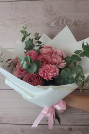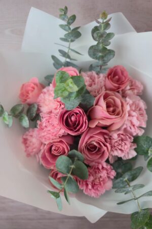 Ramo de mano con Rosas y claveles rosas, por el mes de Octubre