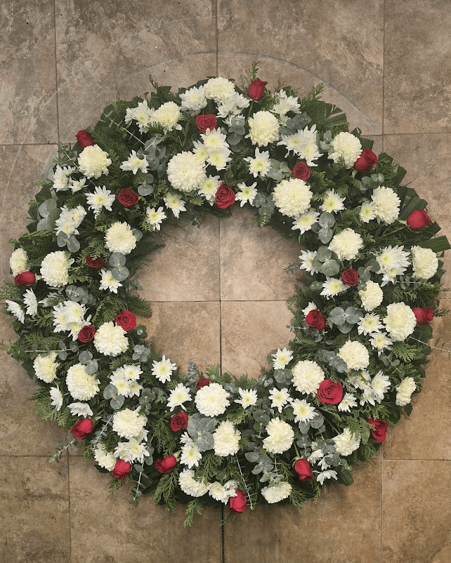 Corona fúnebre grande en aro de color blanco con: