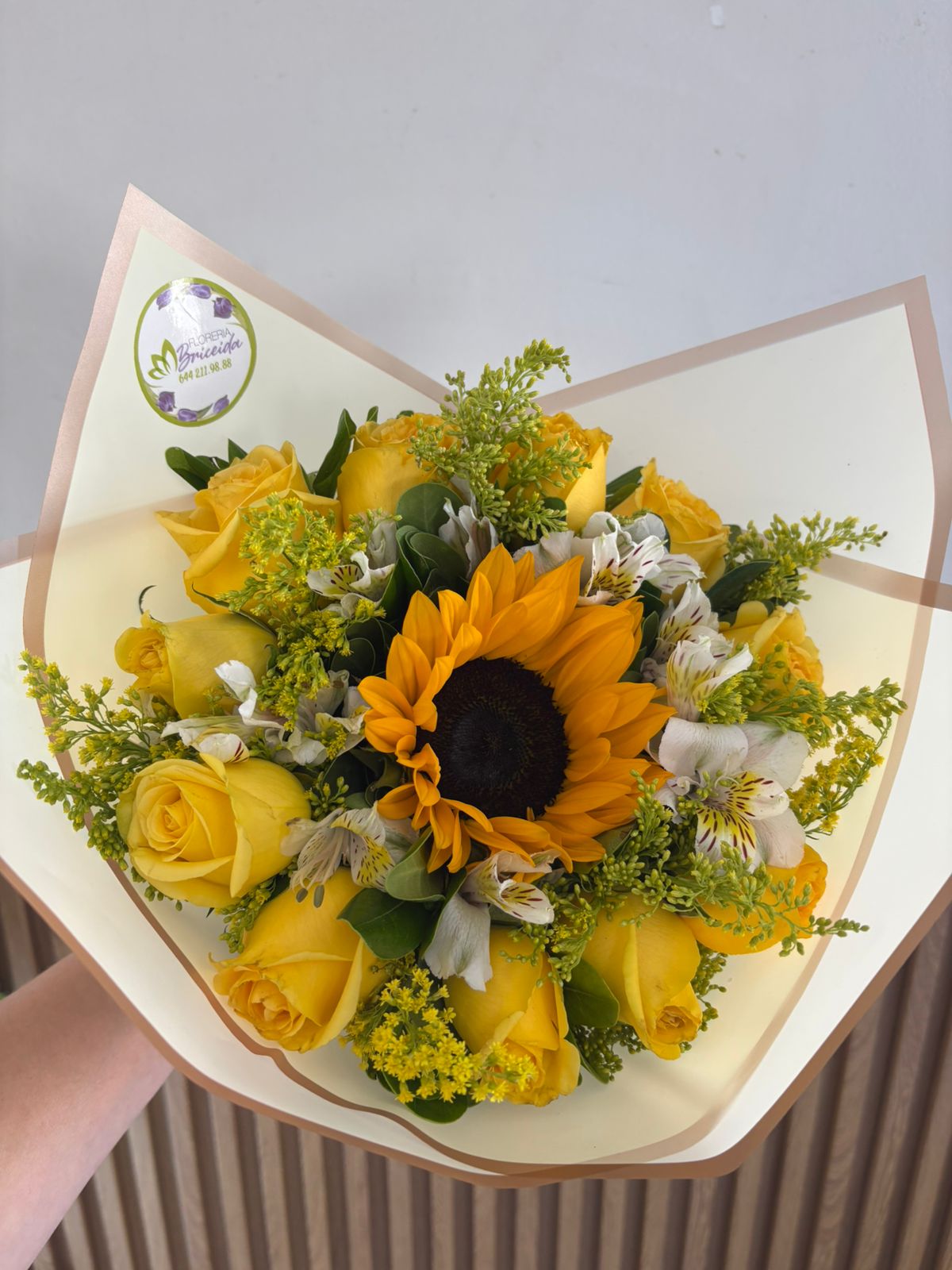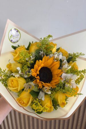 Bouquet con 12 rosas amarillas y 1 girasol envueltas en papel celofán, papel decorativo y moño.