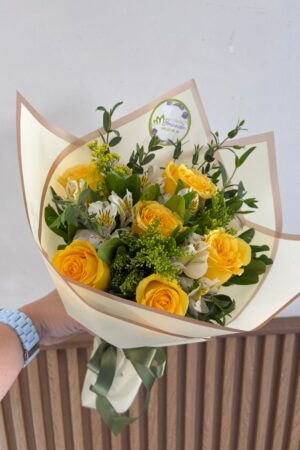 Bouquet con 6 rosas amarillas envueltas en papel celofán, papel decorativo y moño.