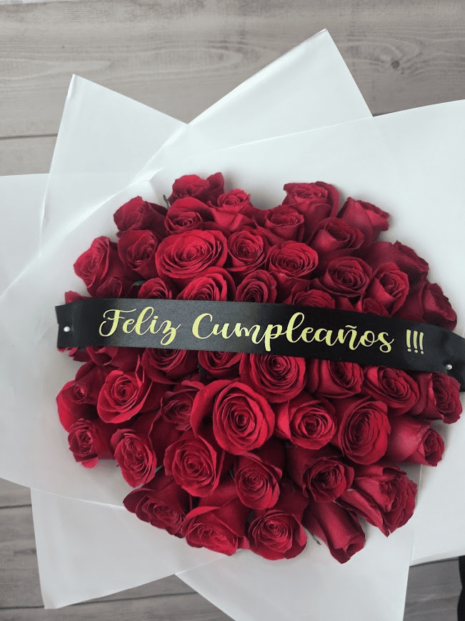 Bouquet con 50 rosas rojas envueltas en papel decorativoy listón de feliz cumpleaños (según existencia) y moño.