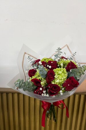 Bouquet con 12 rosas rojas y hortensia verde envueltas en papel decorativo y moño.